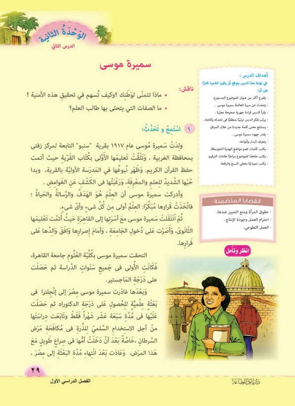 يهدف هذا الدرس إلى تعريف الطلاب بسيرة العالمة المصرية سميرة موسى، التي تُعد من أوائل العالمات العربيات في مجال الفيزياء النووية، حيث كرّست حياتها للبحث العلمي، وسعت لاستخدام الطاقة الذرية في خدمة الإنسان، من خلال هذا الدرس يتعلم الطلاب أهمية العلم ودوره في تقدم الأمم، كما يتعرفون على قيمة الإصرار والطموح في تحقيق النجاح رغم التحديات.