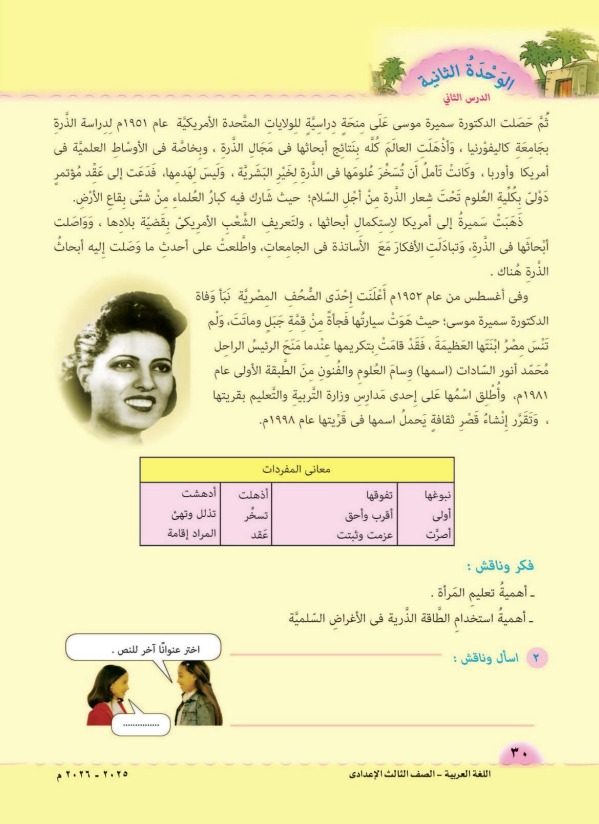 درس سميرة موسى للصف الثالث الإعدادي 2025-2026