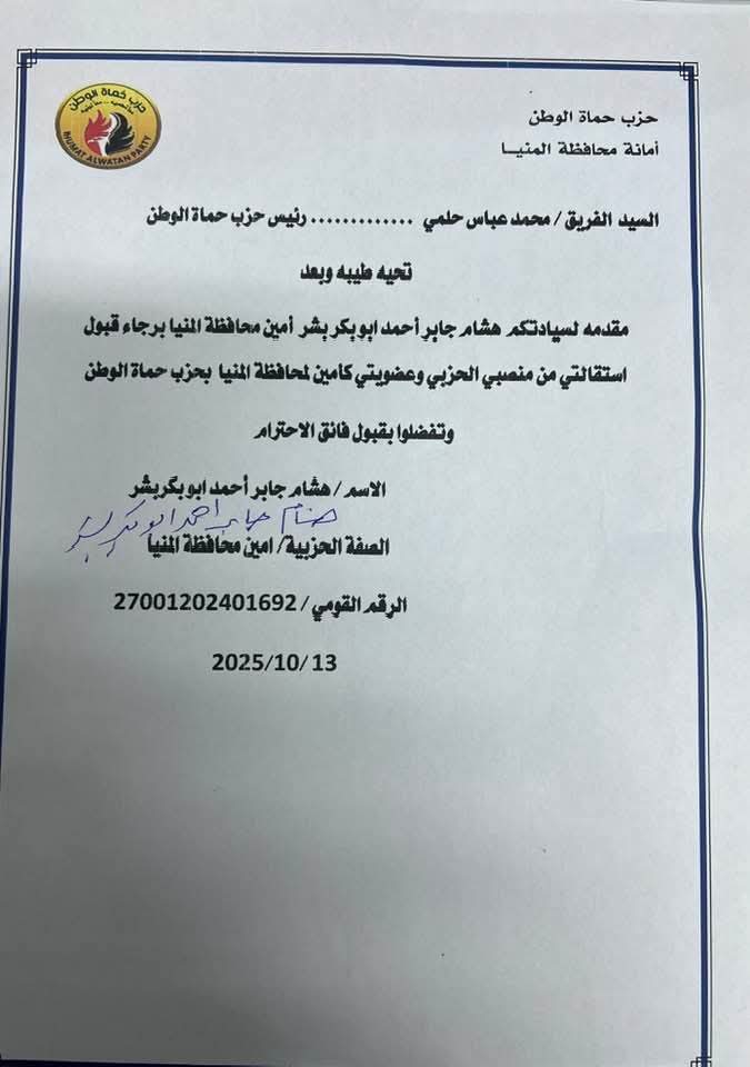 أعلن أمين عام حزب "حماة الوطن" بمحافظة المنيا اللواء هشام بشر، عبر صفحته على مواقع التواصل الاجتماعي، استقالته رسميًا من منصبه، اعتراضًا على استبعاده من قائمة الحزب في الانتخابات المقبلة.
