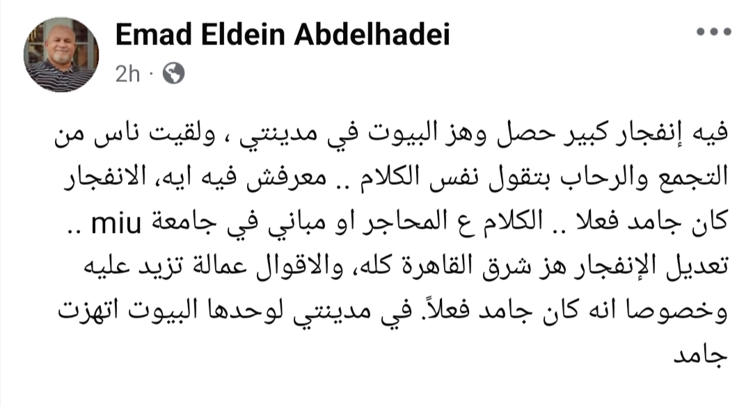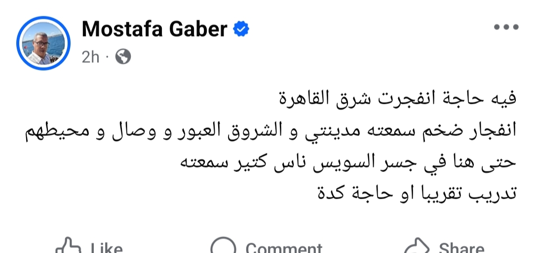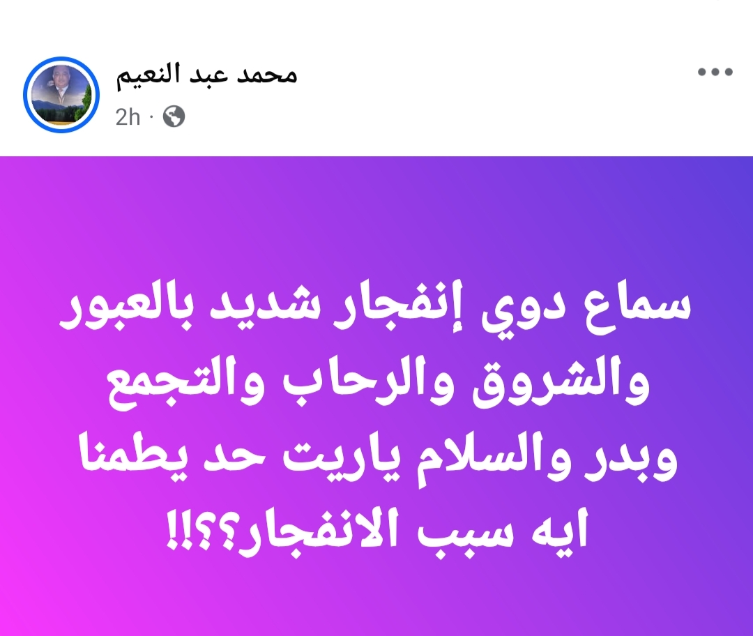 تداول عدد من مستخدمي مواقع التواصل الاجتماعي، صباح اليوم الإثنين، منشورات تفيد بسماع دوي انفجار قوي في منطقة العبور، حيث شعر بعض السكان بهزة خفيفة داخل منازلهم في مناطق التجمع الخامس، بدر، الشروق، وعدد من مناطق القاهرة الجديدة.