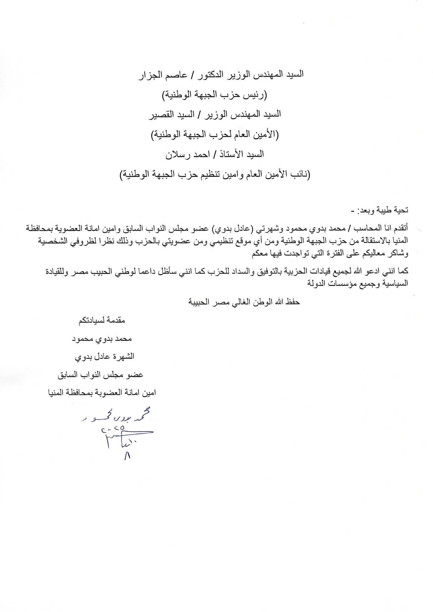 وجاء في البيان: “أتقدم أنا المحاسب: محمد بدوي محمود وشهرتي (عادل) بدوي، عضو مجلس النواب السابق وأمين أمانة العضوية بمحافظة المنيا، بالاستقالة من حزب الجبهة الوطنية ومن أي موقع تنظيمي ومن عضويتي بالحزب، وذلك نظرًا لظروفي الشخصية، وشاكرًا معاليكم على الفترة التي تواجدت فيها معكم".
