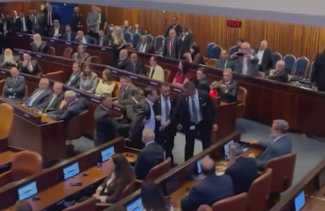 بدأت القصة عندما قاطع عضوا الكنيست أيمن عودة وعوفر كاسيف خطاب ترامب، حيث رفع عودة لافتة كُتب عليها: "اعترفوا بفلسطين – Recognize Palestine"، ما استدعى تدخل عناصر الأمن لإخراجه بعد اشتباكه لفظيًا مع بعض الحضور.