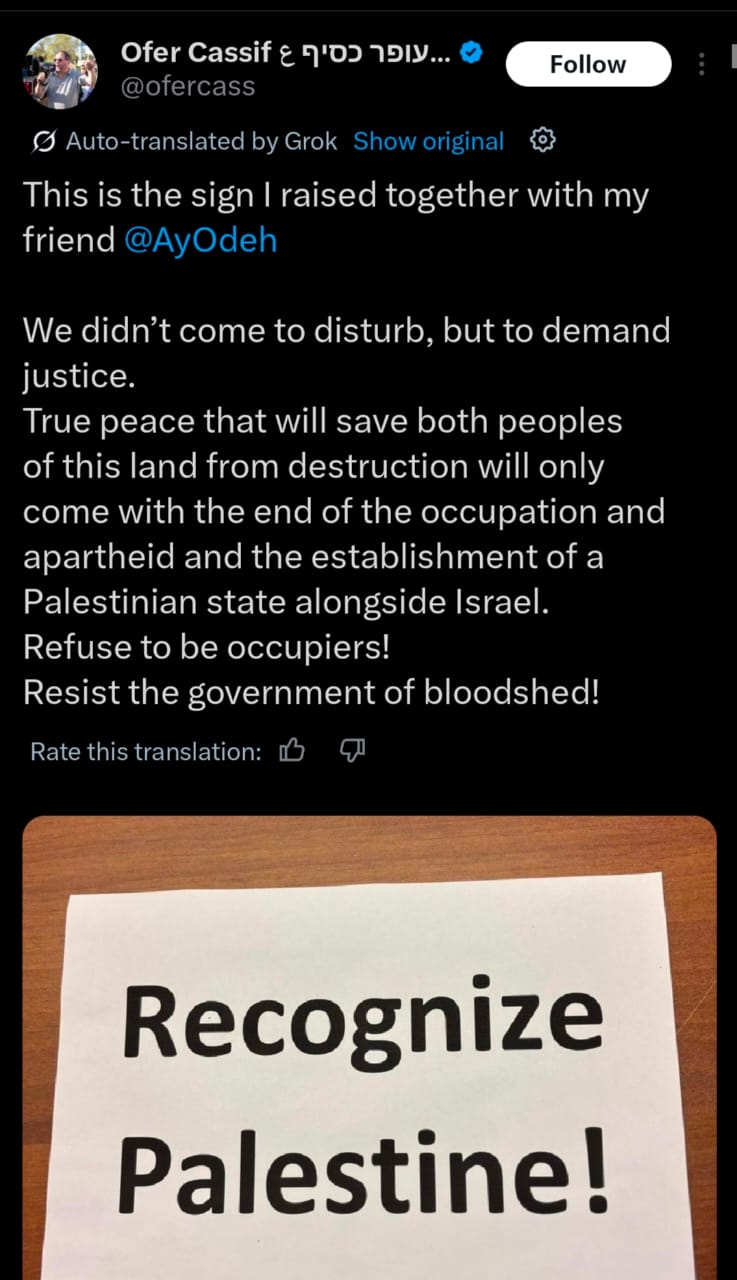 أما النائب عوفر كاسيف فقال في تدوينة له عبر منصة X، مصحوبة بالصورة ذاتها: "هذه هي اللافتة التي رفعتها مع صديقي أيمن عودة. لم نأتِ للتشويش، بل للمطالبة بالعدالة".