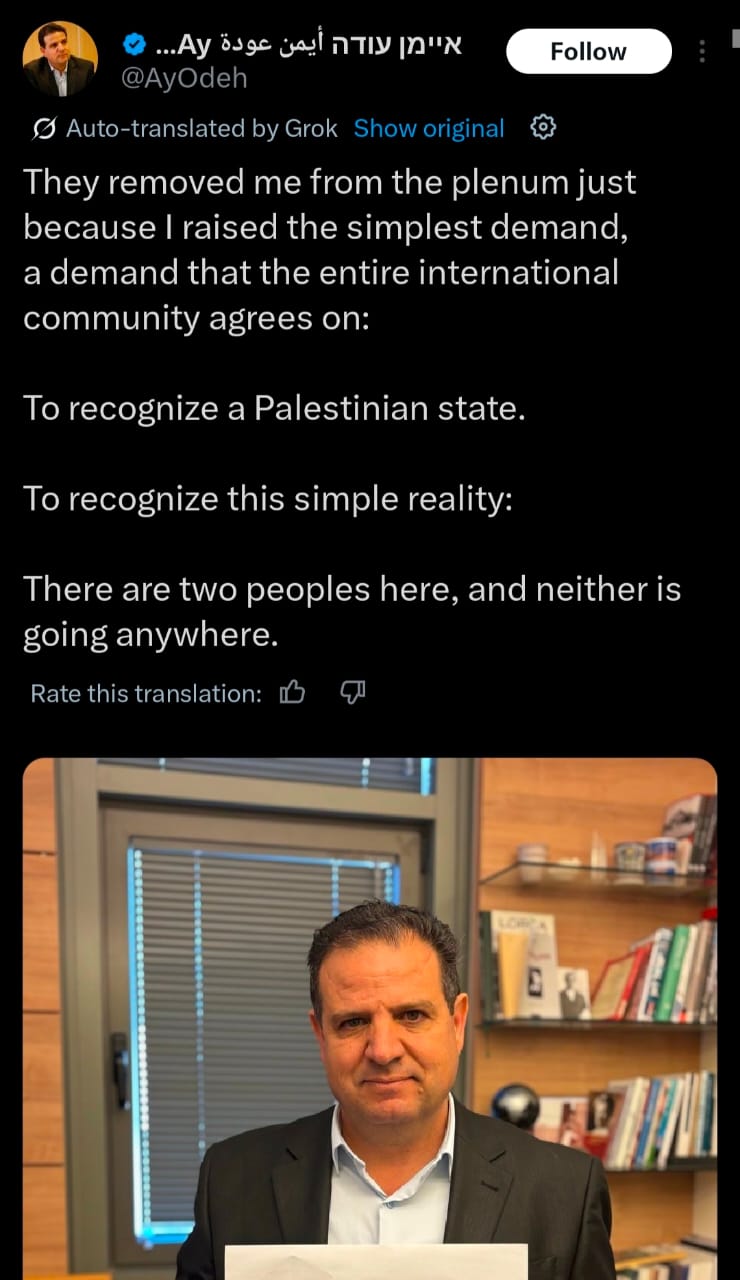 وقال رئيس قائمة الجبهة العربية للتغيير، أيمن عودة، في تدوينة مصحوبة بصورته وهو يحمل اللافتة التي كُتب عليها: "اعترفوا بفلسطين – Recognize Palestine": "طُردت من الجلسة العامة لمجرد طرح مطلب بسيط يتفق عليه المجتمع الدولي بأسره، وهو الاعتراف بدولة فلسطينية".