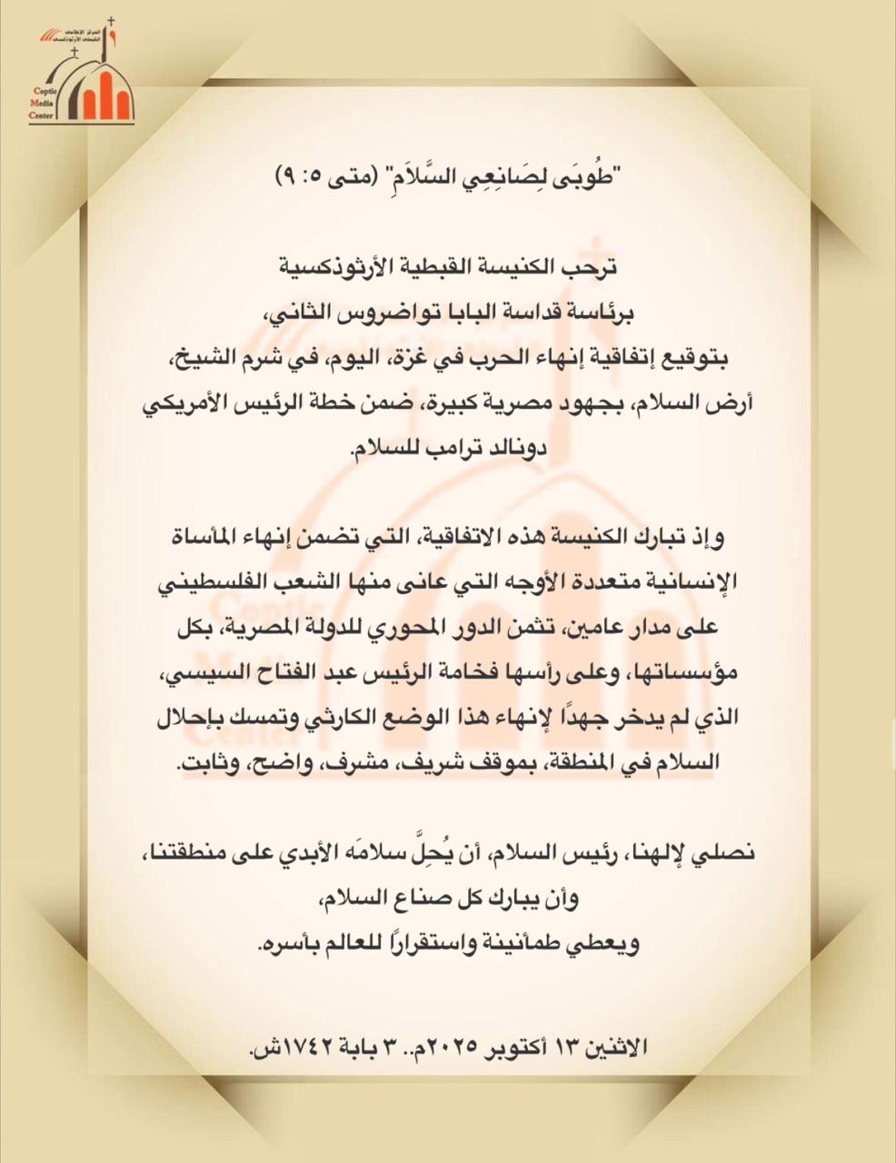 ثمنت الكنيسة القبطية الأرثوذكسية برئاسة البابا تواضروس الثاني، بابا الإسكندرية وبطريرك الكرازة المرقسية توقيع اتفاقية إنهاء الحرب في غزة، اليوم، من مدينة شرم الشيخ.