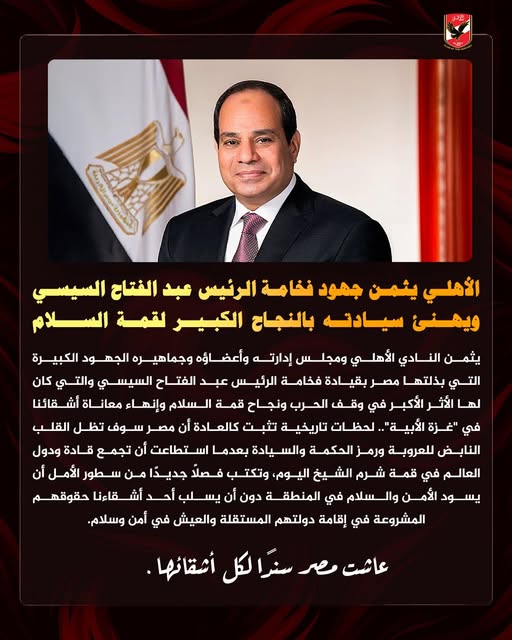 أصدر النادي الأهلي بيانًا رسميًا، أعرب فيه عن تقديره البالغ واعتزازه بالجهود الكبيرة التي بذلتها جمهورية مصر العربية بقيادة الرئيس عبد الفتاح السيسي، والتي كان لها الأثر الأكبر في وقف الحرب ونجاح اتفاقية السلام وإنهاء معاناة الشعب الفلسطيني في غزة.