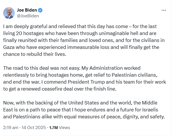 وفي تصريحات نشرها عبر حسابه الرسمي على منصة "إكس"، أعرب بايدن عن امتنانه العميق وارتياحه لنتائج القمة، مؤكدًا أن وقف إطلاق النار يمثل انفراجة إنسانية كبرى في واحدة من أكثر الفترات دموية وتعقيدًا في المنطقة.