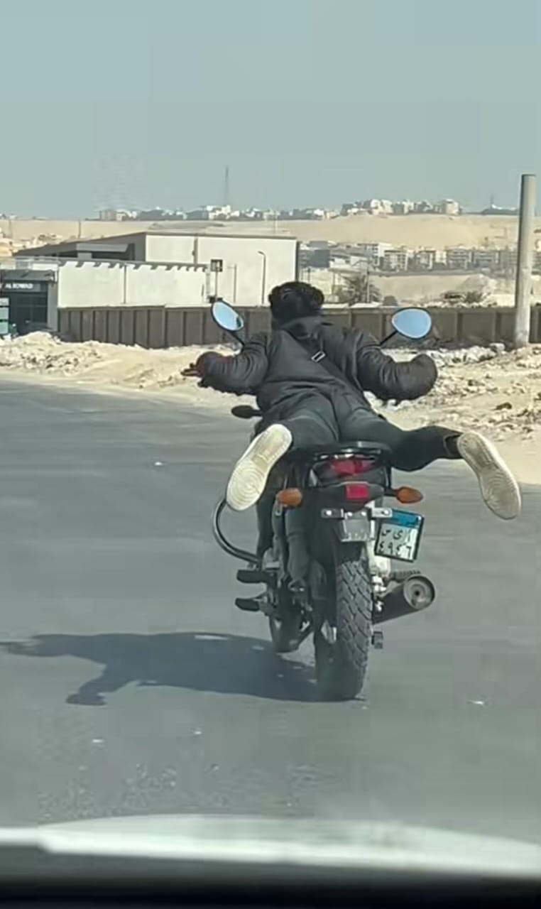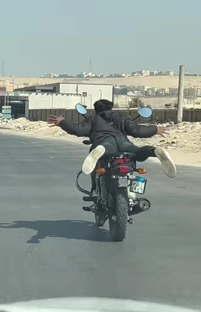 وأظهر الفيديو الشاب وهو يفرد ذراعيه وساقيه أثناء قيادته الدراجة النارية، في مشهد أثار دهشة المارة واستياء مستخدمي الطريق.