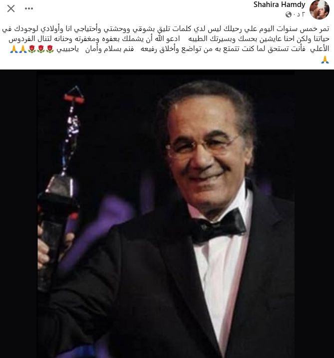 وكتبت عبر حسابها الرسمي بموقع “فيسبوك”: "تمر خمس سنوات اليوم على رحيلك، ليس لدي كلمات تليق بشوقي واحتياجي أنا وأولادي لوجودك في حياتنا، ولكن إحنا عايشين بحسك وبسيرتك الطيبة، أدعو الله أن يشملك بعفوه ومغفرته وحنانه لتنال الفردوس الأعلى، فأنت تستحق لما كنت تتمتع به من تواضع وأخلاق رفيعة، فنم بسلام وأمان يا حبيبي".