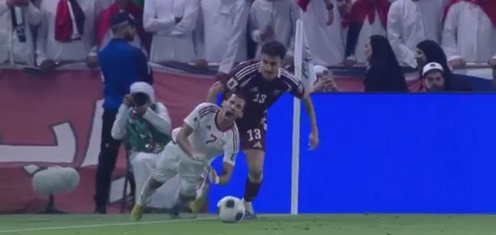 وفي الدقيقة 40، جائت ضربة حرة لقطر وعرضية من أكرم عفيف خارج منطقة الجزاء وارتقاء وإبعاد من دفاع الإمارات.