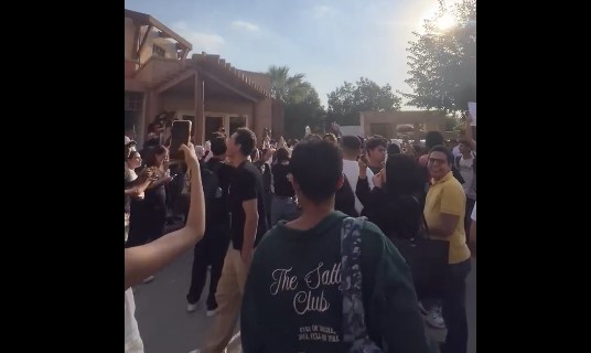 وردد الطلاب هتافات غاضبة، من بينها “مش هانمشي… هو يمشي” أمام القاعة التي كانت مخصصة لاستضافته.