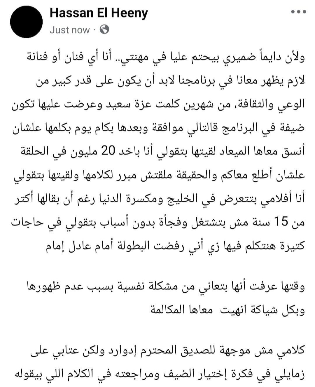 وكتب الهيني عبر حسابه بمنصة “فيسبوك”: "أي فنان أو فنانة لازم يظهر معانا في برنامجنا لا بد أن يكون على قدر كبير من الوعي والثقافة، من شهرين كلمت عزة سعيد وعرضت عليها تكون ضيفة في البرنامج قالت لي موافقة”.
