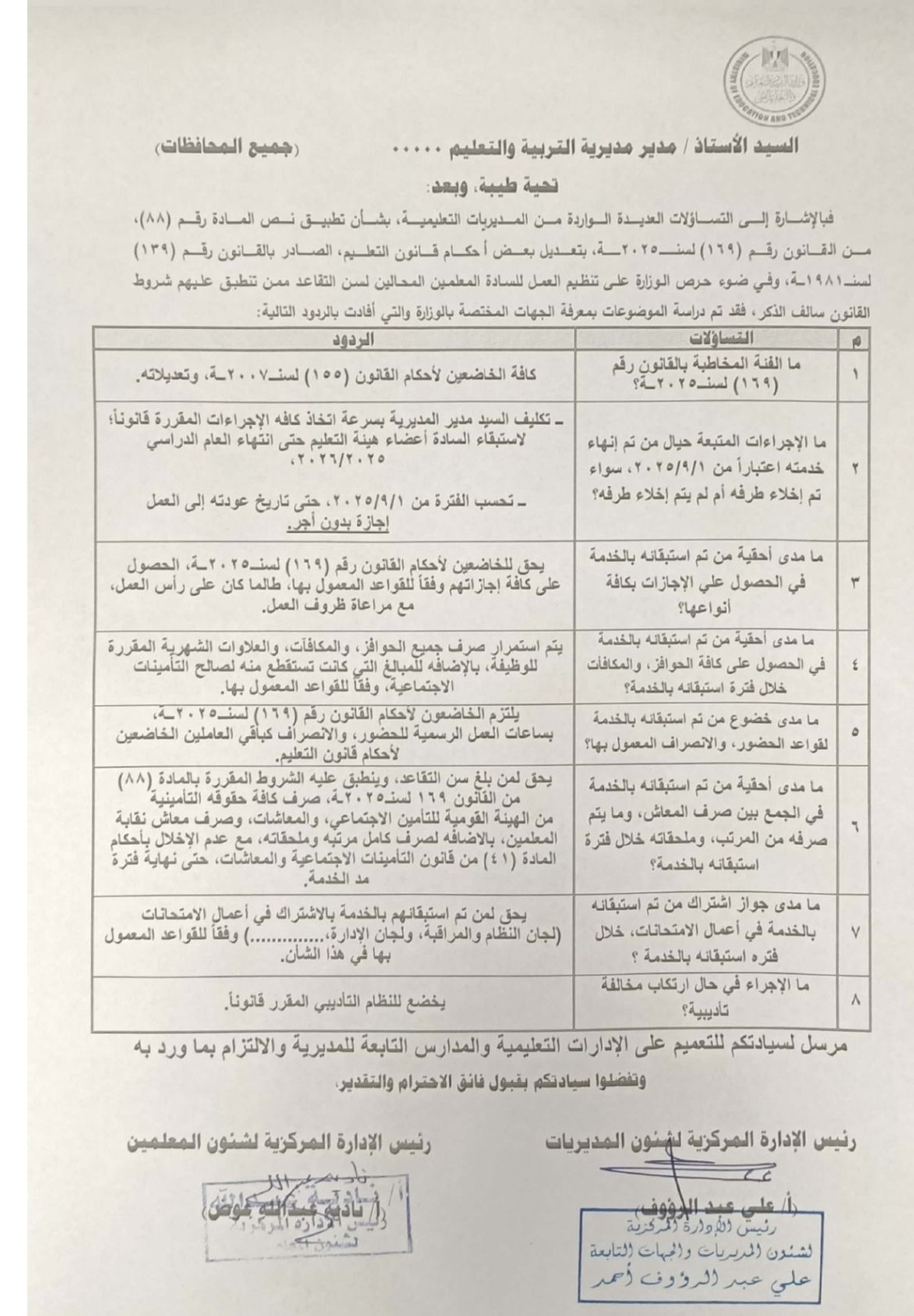 تكليف مدير المديرية بسرعة اتخاذ كافة الإجراءات المقررة قانوناً؛ لاستبقاء أعضاء هيئة التعليم حتى انتهاء العام الدراسي 2025-2026 وتحسب الفترة من 1 سبتمبر، حتى تاريخ عودته إلى العمل إجازة بدون أجر.
