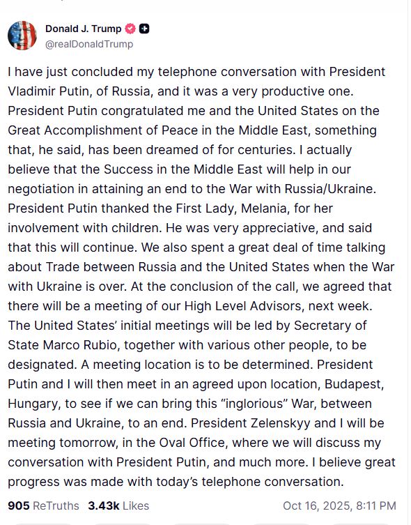 ولفت ترامب خلال منشور له على منصة تروث سوشيال، إلى إشادة الرئيس الروسي بالدور الذي قامت به الولايات المتحدة لتحقيق السلام في الشرق الأوسط، واصفًا الاتفاق “أمر طالما حلم به الجميع منذ قرون”، بحسب قوله.