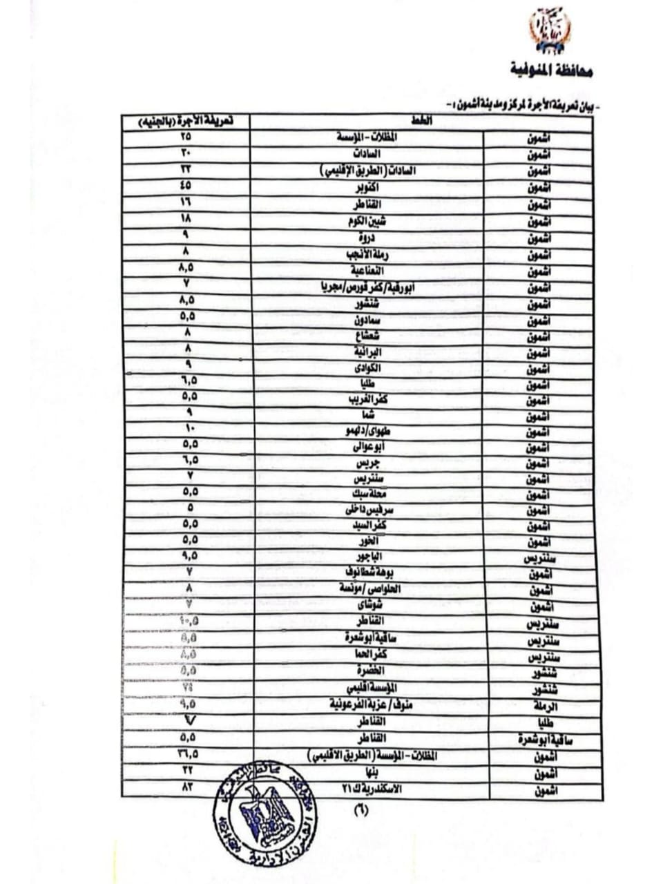 بيان تعريفة الأجرة بمركز أشمون