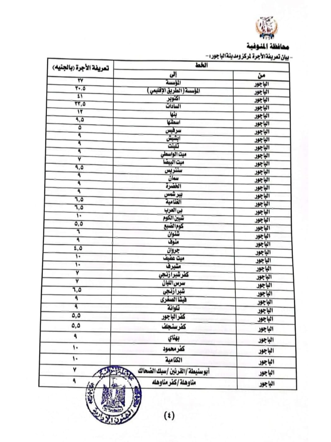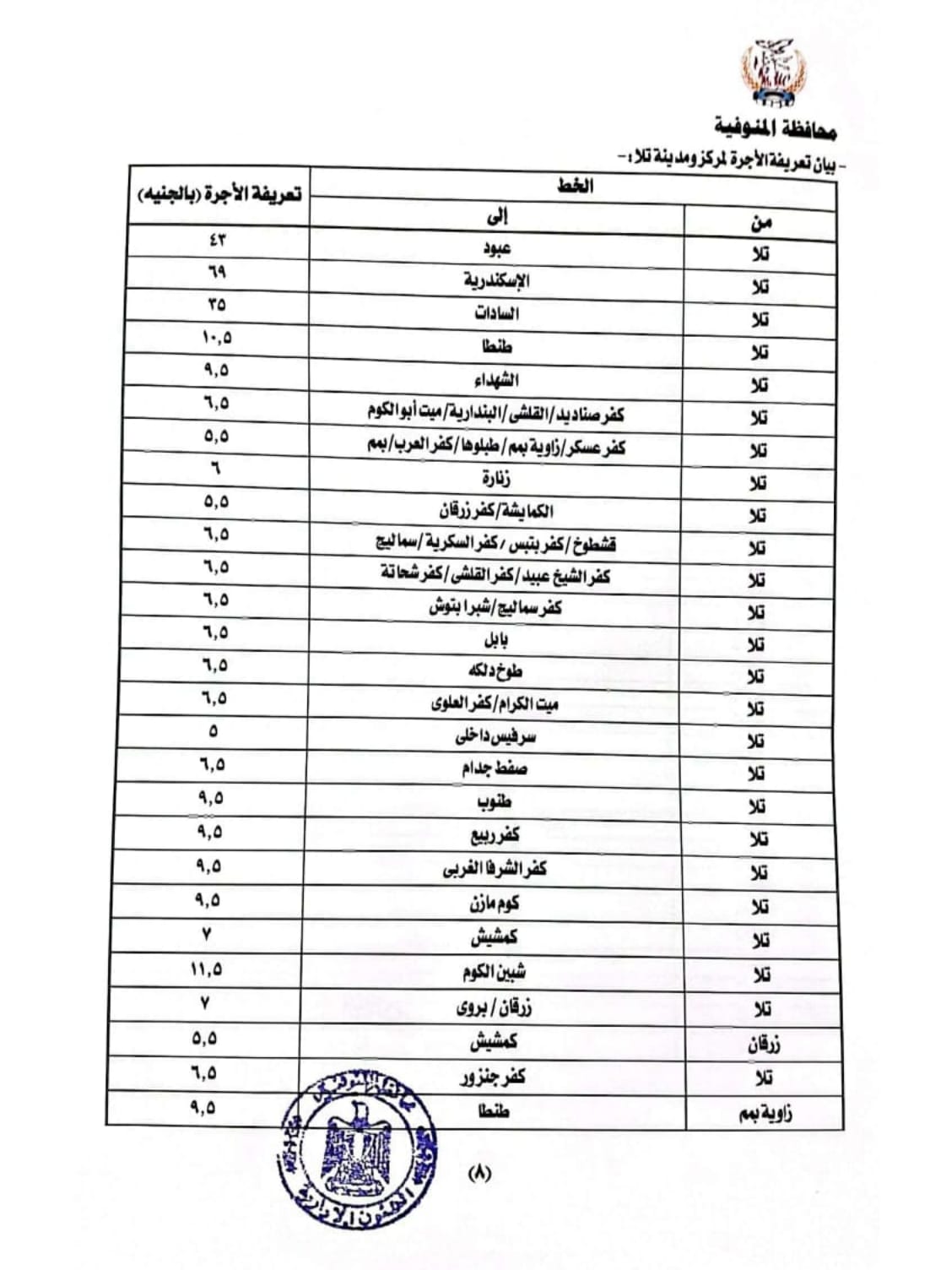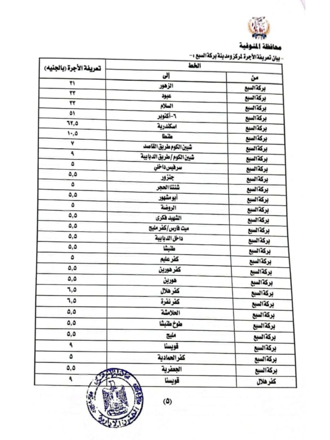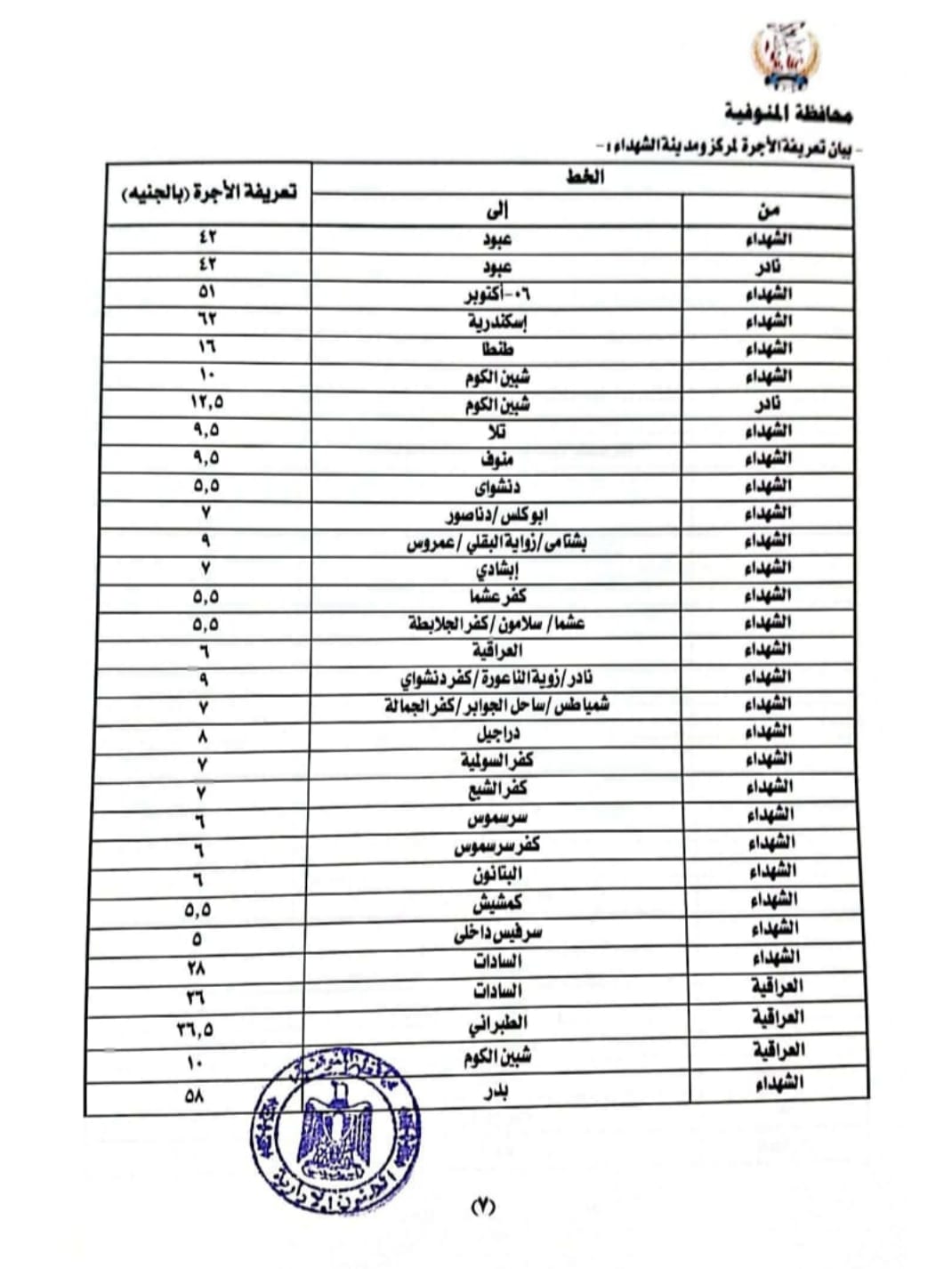 بيان تعريفة الأجرة بمركز سرس الليان ومنوف