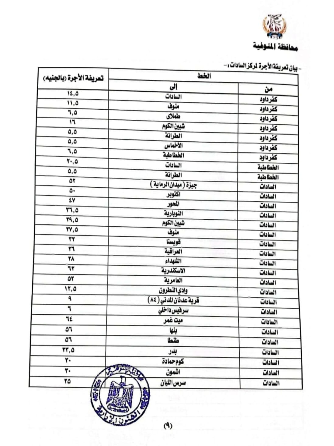 بيان تعريفة الأجرة بمركز السادات وكفر داوود