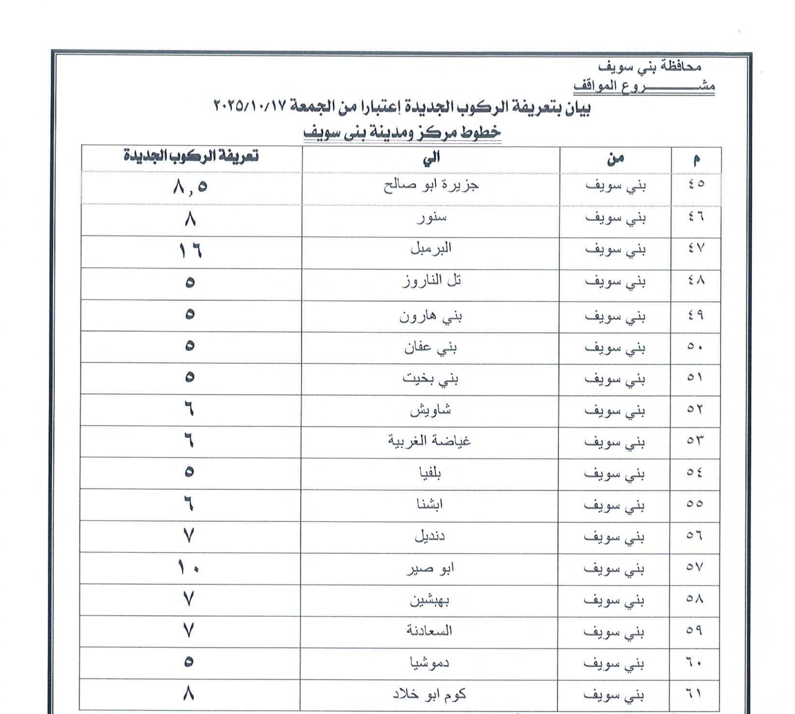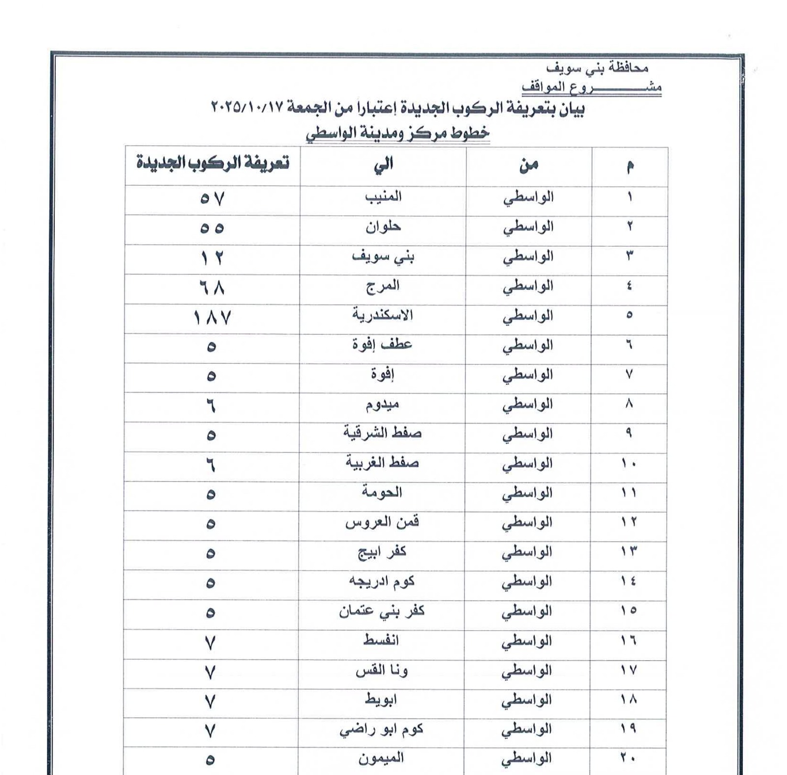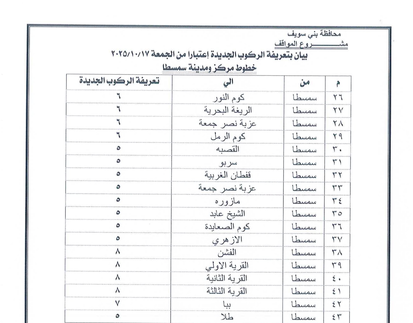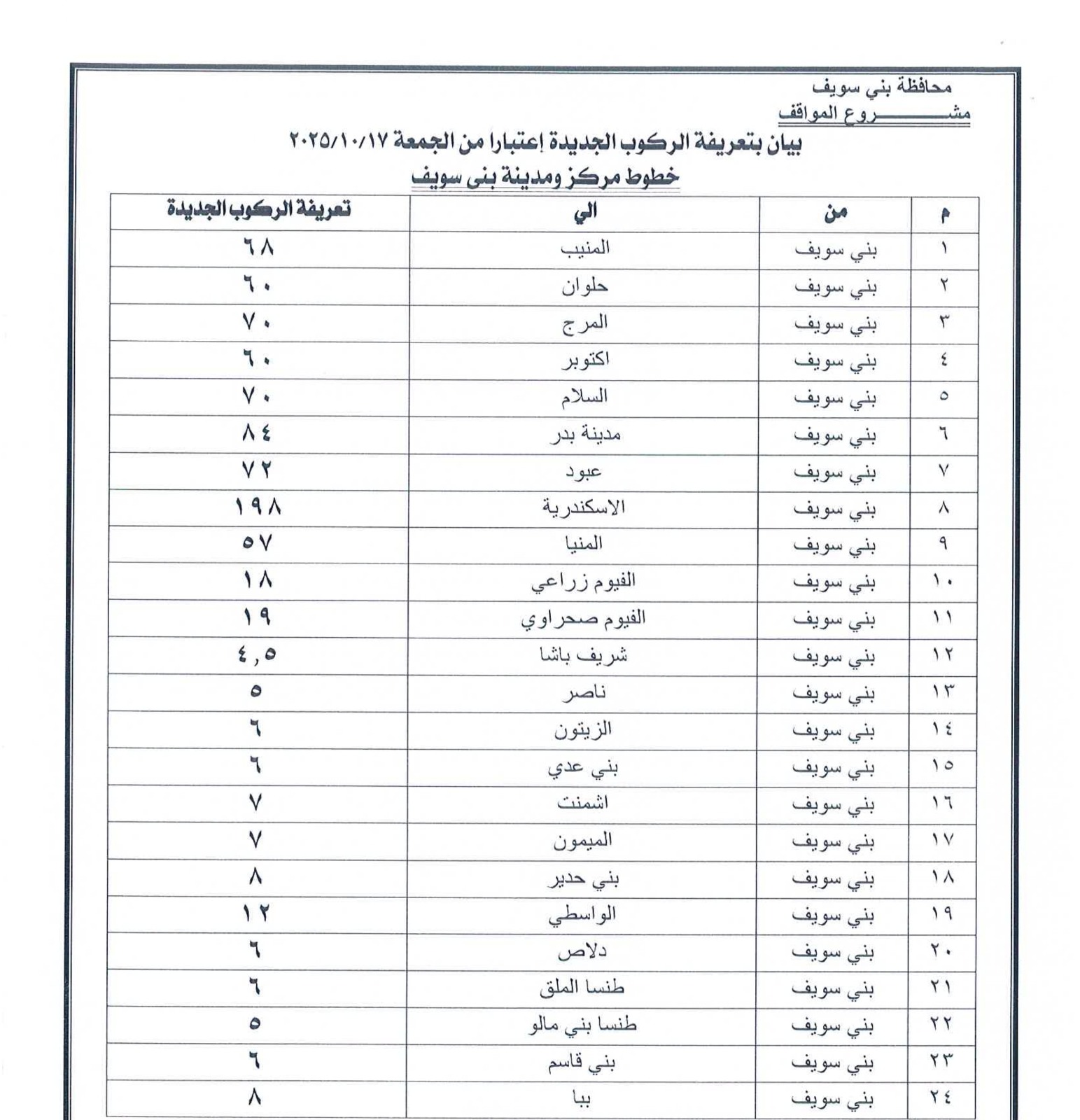 تعريفة الركوب الجديدة في بني سويف بعد تحريك أسعار الوقود