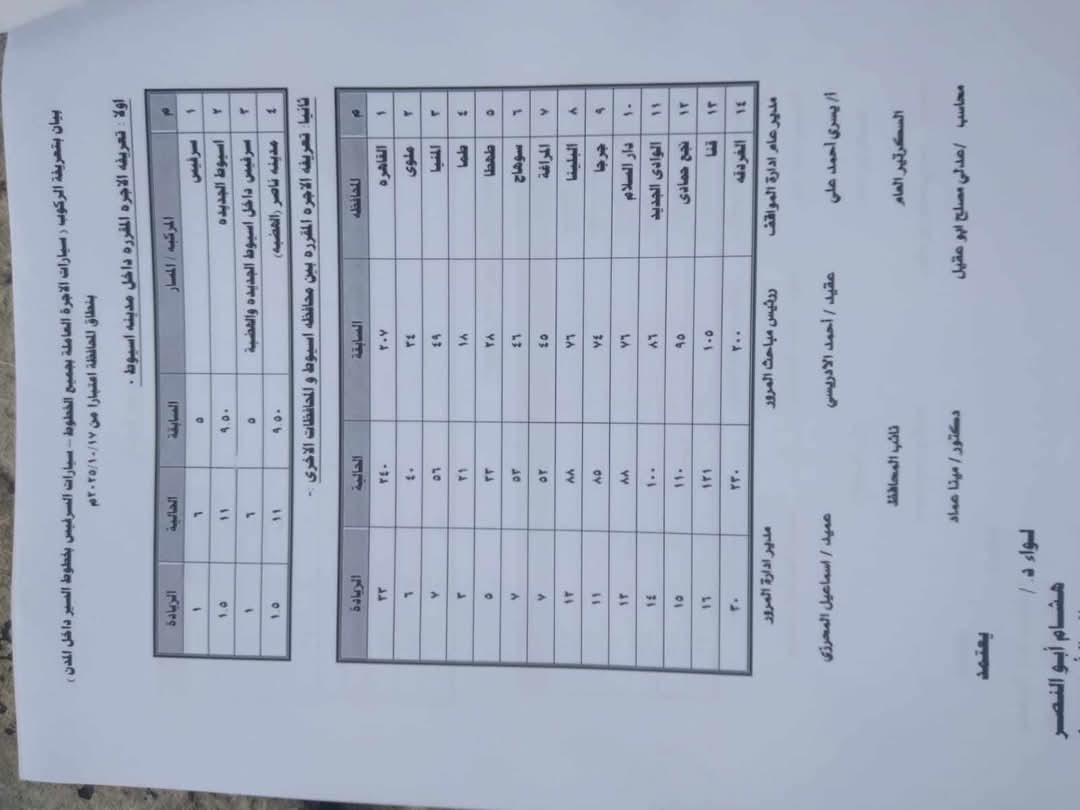 وأكد المحافظ، أن الهدف من القرار هو حماية المواطنين من أي استغلال، وضبط منظومة النقل، مشددًا على تنفيذ حملات ميدانية مفاجئة على مواقف السيارات ومحطات الوقود والأسواق للتأكد من الالتزام بالتعريفة الجديدة، واتخاذ الإجراءات القانونية ضد أي مخالفات.