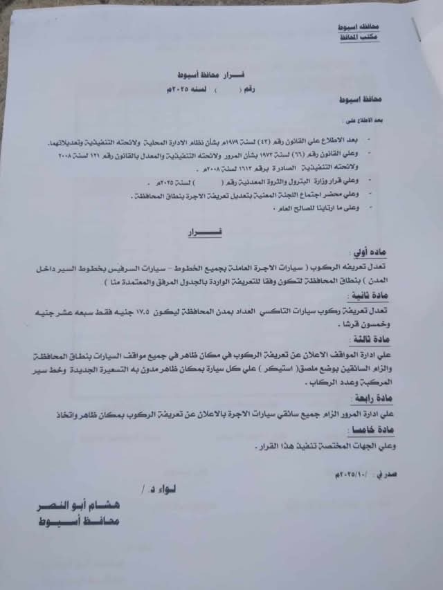 اعتمد محافظ أسيوط، اللواء دكتور هشام أبو النصر، اليوم الجمعة، التعريفة الجديدة لأجور وسائل النقل داخل المحافظة وخارجها، وذلك عقب تعديل أسعار البنزين والسولار من قبل لجنة التسعير التلقائي للمنتجات البترولية.