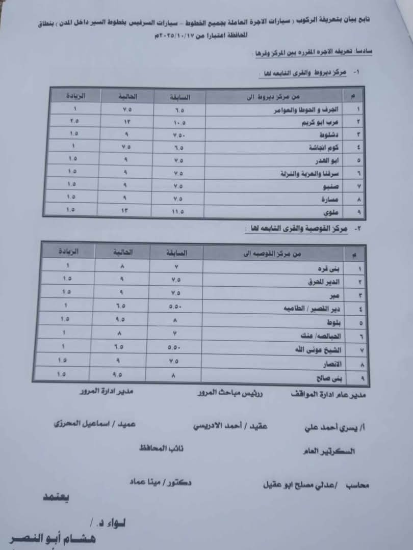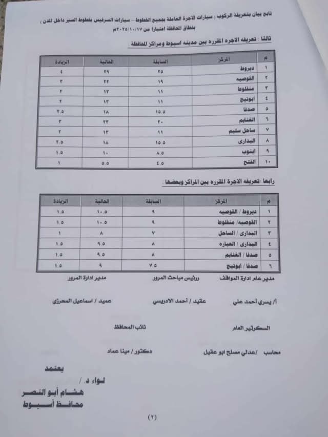 أما الأجرة بين مدينة أسيوط والمراكز، فجاءت على النحو التالي: