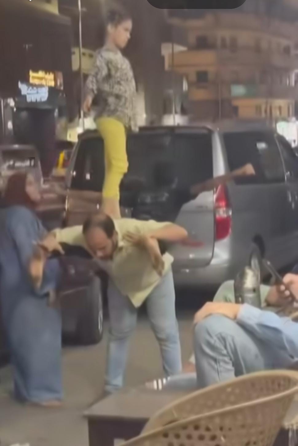 يظهر في مقطع الفيديو، الأب وهو يحمل ابنه بين ذراعيه، وابنته على ظهره بشكل بهلواني أمام الحضور من الجالسين على كراسي القهوة، بينما تنتظر الأم التي ترتدي جلبابا وطرحة، انتهاء العرض حتى تساعد ابنتها على النزول للأرض.