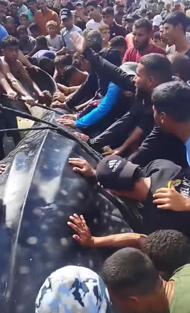 تداول مستخدمو منصات السوشيال ميديا مقطع فيديو لسمكة عملاقة طولها حوالي 10 أمتار ووزنها تقريبًا 2 طن ظهرت بأحدى شواطئ خان يونس في جنوب قطاع غزة التي تطل على البحر المتوسط، ويحاوطها آلاف النازحين بفرحة عارمة تظهر على وجوههم.