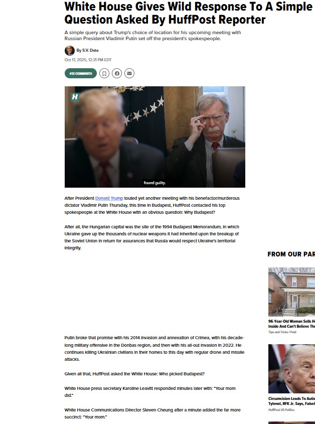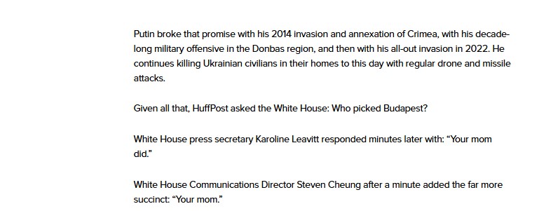 وردت ليفيت بعد دقائق بتعليق ساخر: “أمك هي من اختارت بودابست”، في حين اقتصر مدير الاتصالات في البيت الأبيض، ستيفن تشيونج، على الرد بكلمة واحدة: "أمك".