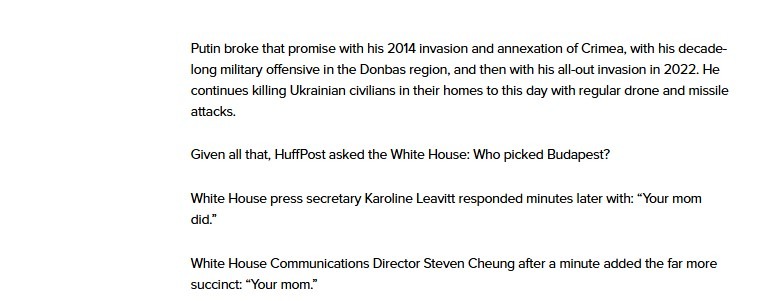 وخلال تفاعل عبر إحدى منصات الاتصال الرسمية الخاصة بالبيت الأبيض، وجه مراسل موقع "هاف بوست" سؤالًا عن سبب اختيار بودابست لاستضافة القمة بين الرئيسين الأمريكي والروسي، لترد المتحدثة بعد دقائق بتعليق غير متوقع قالت فيه: "أمك هي من فعلت".