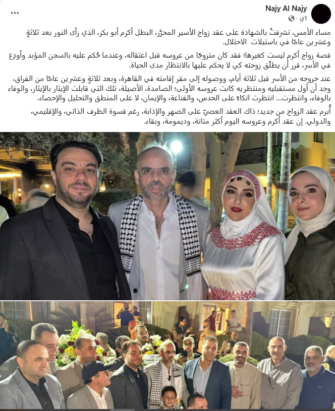وكتب الناجي على حسابه الشخصي بفيسبوك: "مساء الأمس، تشرفتُ بالشهادة على عقد زواج الأسير المحرَّر، البطل أكرم أبو بكر، الذي رأى النور بعد ثلاثةٍ وعشرين عامًا في باستيلات الاحتلال".