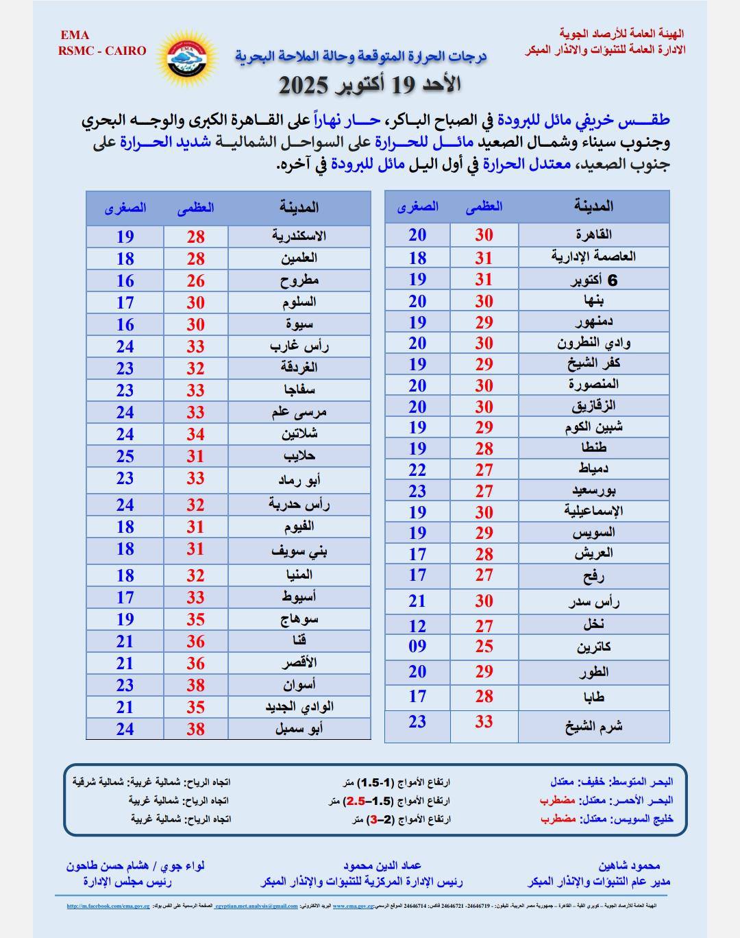 كشفت الهيئة العامة للأرصاد الجوية، عن حالة الطقس المتوقعة، غدًا، إذ يسود طقس خريفي، مائل للبرودة في الصباح الباكر، حار نهارًا على القاهرة الكبرى والوجه البحري، وجنوب سيناء وشمال الصعيد، مائل للحرارة على السواحل الشمالية، شديد الحرارة على جنوب الصعيد، معتدل الحرارة في أول الليل، مائل للبرودة في آخره.