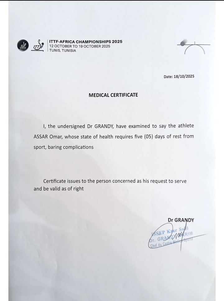 وأوضح المصدر:" أن اللاعب كان من المفترض أن يشارك في بطولة لندن بعد البطولة الأفريقية بيومين فقط، لكنه اعتذر بسبب حالته الصحية، قبل أن يطالبه كل من أشرف عبد الفتاح رئيس البعثة، وعادل شومان المدرب العام، ومجدي حتاتة مدرب الرجال، بمحاولة المشاركة ولو في مباراة واحدة فقط".