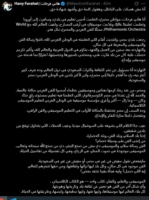 وكتب هاني فرحات منشورًا عبر حسابه الرسمي بمنصة “إكس”: “أنا مش هسكت على الباطل، وهقول كلمة حق وأشهد شهادة حق، أنا هاني فرحات، مواطن مصري، اتعلمت أحسن تعليم في بلدي، وسافرت إلى أوروبا وتعلمت تعليمًا عاليًا، وقدّمت موسيقى في أرقى المسارح، ولفيت العالم كله مع World Philharmonic Orchestra، ممثلًا للفن العربي والمصري بكل فخر”.
