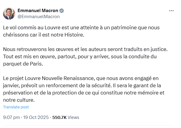وفي بيان نُشر عبر حسابه الرسمي على منصة "إكس"، أكد ماكرون أن السلطات الفرنسية تبذل قصارى جهدها لاستعادة القطع الفنية المسروقة من متحف اللوفر، قائلًا: "سنستعيد الأعمال، وسيُقدَّم المسؤولون عنها إلى العدالة"، مشيرًا إلى أن الإجراءات تتم تحت إشراف نيابة باريس.
