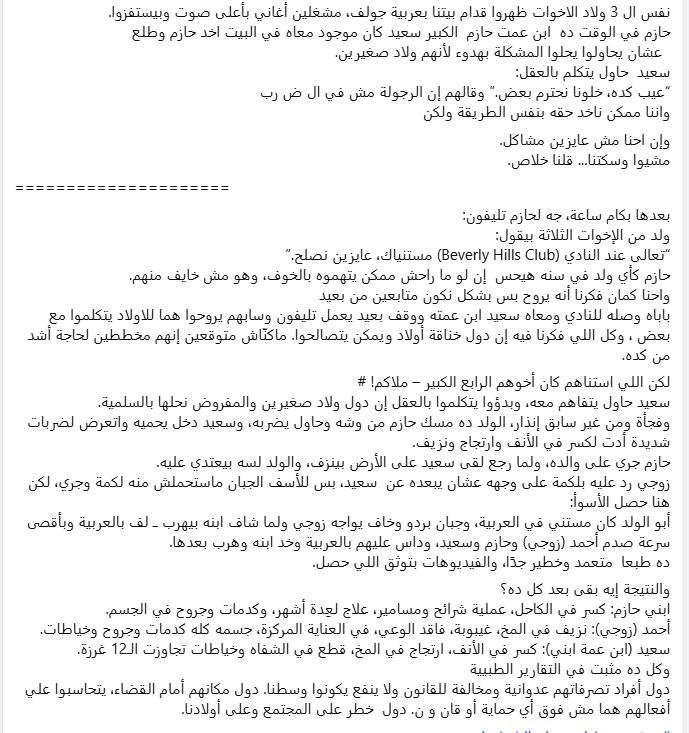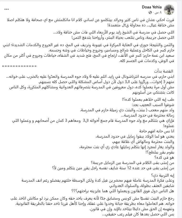 وأضافت والدة الطفل في منشورها عبر صفحتها على فيسبوك، أن الأشقاء الثلاثة قاموا بمساعدة 3 آخرين من زملائهم بالاعتداء على ابنها في المدرسة ولم يكتفوا بذلك، بل حضروا إلى المنزل بعربة جولف، وقاموا بتشغيل أغاني لاستفزاز ابنها ومضايقته، وكان معه في البيت ابن عمته، واتفقوا على مقابلة الأطفال الآخرين أمام نادي بالكمبوند لحل المشكلة.