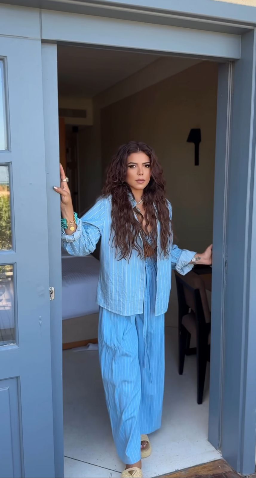وخلال مشاركتها في اليوم الرابع من المهرجان، ظهرت ناهد السباعي ببيجامة مخططة باللون السماوي في اختيار جريء وغير تقليدي، عكس طابعها العصري وروحها المرحة، واعتمدت تسريحة شعر منسدل على الكتفين، ما منحها إطلالة ناعمة وشبابية جذبت عدسات المصورين وأنظار الحضور.