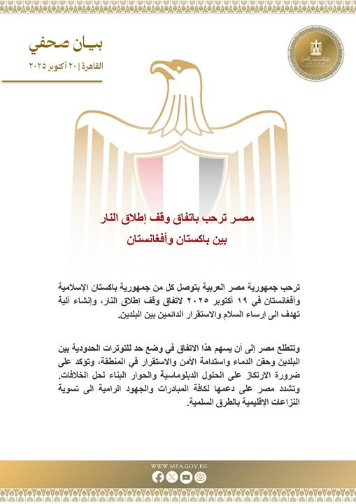 رحبت مصر بتوصل باكستان وأفغانستان لاتفاق لوقف إطلاق النار، وإنشاء آلية تهدف إلى إرساء السلام والاستقرار الدائمين بين البلدين.