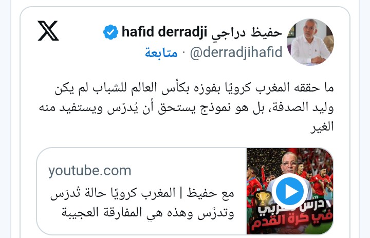 وقال دراجي في تدوينة عبر حسابه الرسمي على منصة "إكس":" ما حققه المغرب كرويًا بفوزه بكأس العالم للشباب لم يكن وليد الصدفة، بل هو نموذج يستحق أن يُدرّس ويستفيد منه الغير.