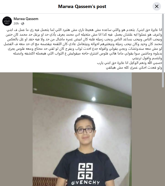وقالت الأم في منشورها: "أنا عايزة حق ابني، يتعدم هو واللي ساعده، مش هعيط وناري مش هتبرد غير لما يتعمل فيه زي ما عمل في ابني، وأعرف هو عمل فيه كده ليه"، مضيفة أنها لا تزال غير مصدقة أن ابنها “محمد” يمكن أن يتعرض للأذى، واصفة إياه بأنه كان محبوبًا من الجميع وطيب القلب.