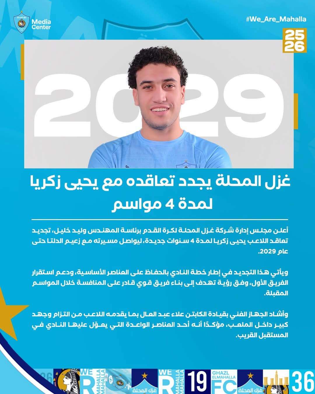 أعلن مجلس إدارة شركة غزل المحلة لكرة القدم برئاسة المهندس وليد خليل، تجديد عقد اللاعب يحيى زكريا لمدة 4 سنوات، ليواصل مسيرته مع زعيم الدلتا حتى عام 2029.
