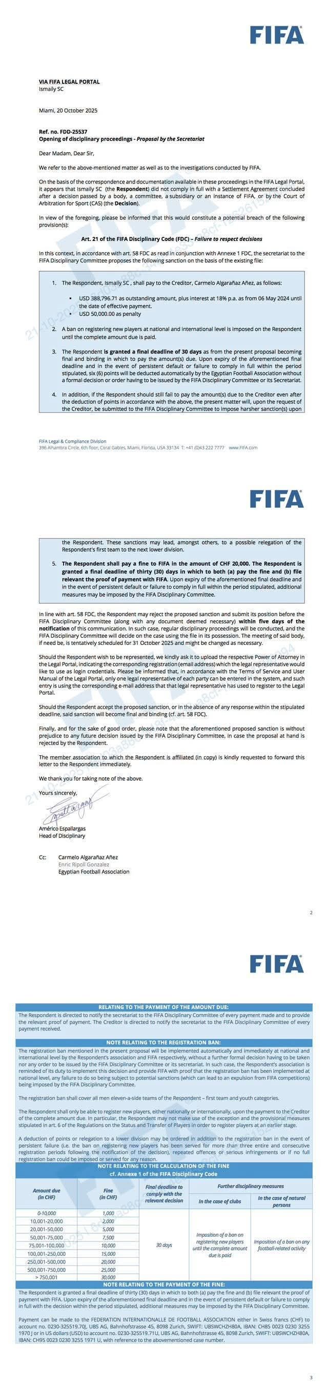 أكد (فيفا) في خطابه أن الإسماعيلي لم يلتزم باتفاق التسوية الموقع مع اللاعب، ما اعتبره مخالفة صريحة للمادة 21 من قانون الانضباط الخاص بالاتحاد الدولي لكرة القدم.