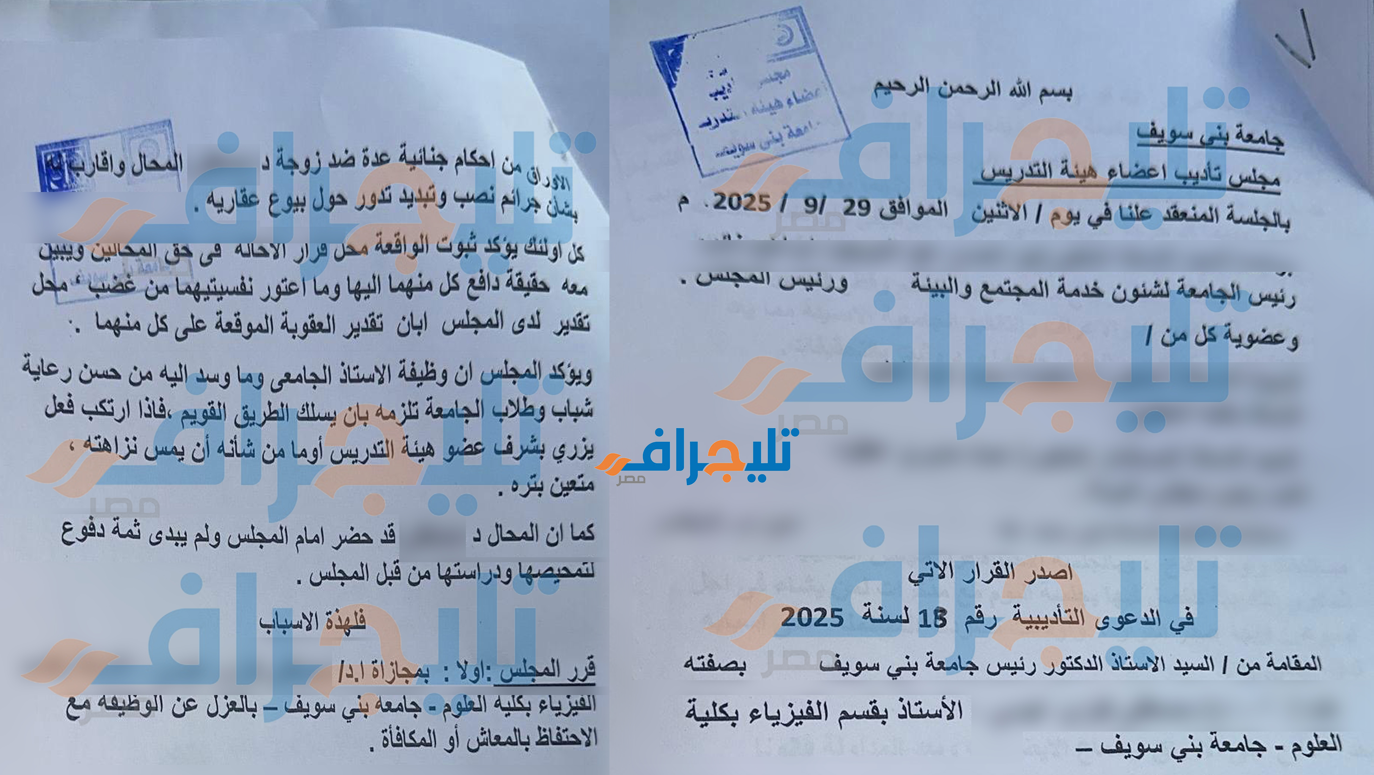 حصلت “تليجراف مصر” على مستندات رسمية صادرة عن جامعة بني سويف تكشف عن صدور قرار تأديبي بعزل الدكتور "مصطفى.ف" أستاذ الفيزياء بكلية العلوم من وظيفته الجامعية، على خلفية اتهامه في قضايا جنائية تتعلق بالنصب والتدليس في بيع عقارات لزوجته وعدد من أقاربه.