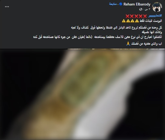 ونشرت إحدى الفتيات منشورًا عبر “ فيسبوك” كتبت فيه: “كل واحدة من فضلكم تروح تأخذ البادز "الفوط الصحية النسائية" اللي عندها وتحطها فوق كشاف أو لمبة وتتأكد أنها نضيفة اكتشفوا إمبارح أن فيه نوع معين للأسف معظمنا بيستخدمه مليان عفن من جوه كأنها مستخدمة قبل كده”.