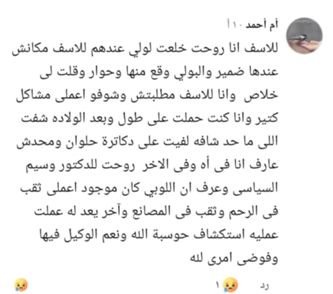 بينما علقت أم أحمد على منشور شيماء وكتبت تجربتها مع الطبيبة مشيرة إلى أنها أصيبت بثقب في الرحم نتيجة تركيب اللولب أيضًا.