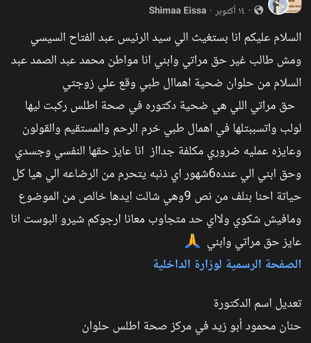 كتبت سيدة تدعى شيماء عيسى منشورًا عبر “فيسبوك” تستغيث فيه بالجهات المعنية بعد تعرضها لما وصفته بإهمال طبي خلال إجراء عملية تركيب “لولب” نتج عنه ثقب في الرحم والقولون والمستقيم.
