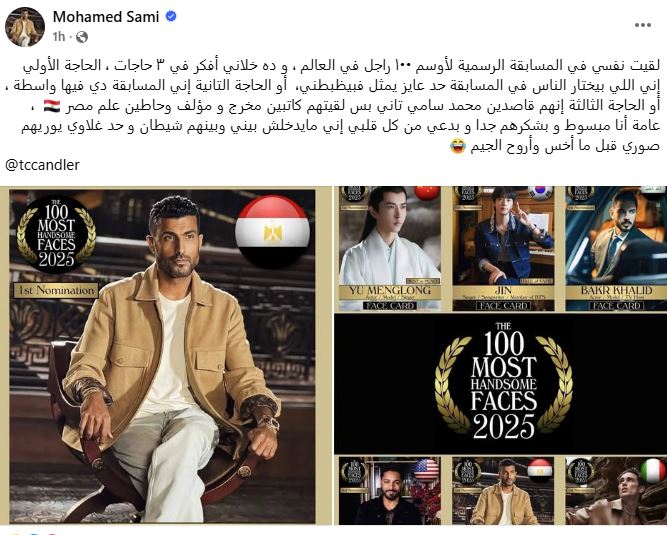 وعبّر سامي عن سعادته بهذا الاختيار بطريقته الطريفة، حيث نشر عبر حسابه الرسمي على موقع فيسبوك منشورًا قال فيه: “لقيت نفسي في المسابقة الرسمية لأوسم 100 راجل في العالم، وده خلاني أفكر في 3 حاجات؛ الأولى إن اللي بيختار الناس في المسابقة حد عايز يمثل فبيظبطني، أو التانية إن المسابقة فيها واسطة، أو التالتة إنهم قاصدين محمد سامي تاني، بس لقيتهم كاتبين مخرج ومؤلف وحاطين علم مصر”.