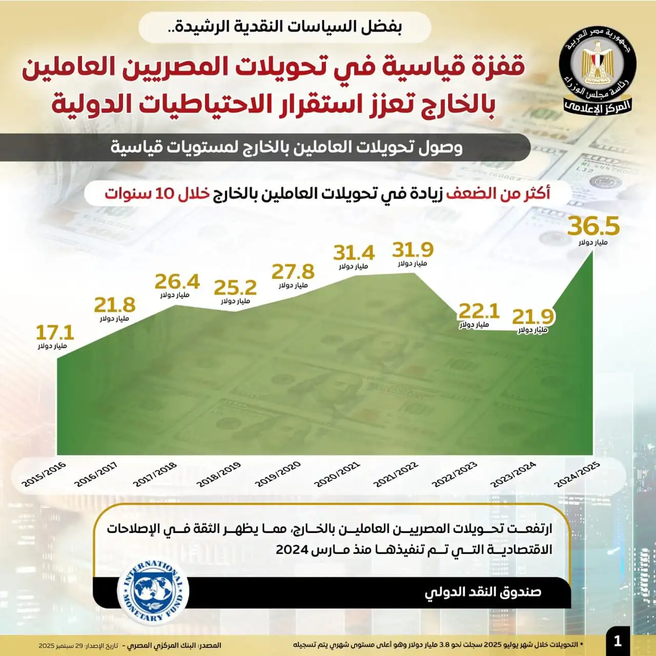 وأشار مجلس الوزراء، في 29 سبتمبر الماضي، إلى أن تحويلات المصريين بالخارج تضاعفت خلال العقد الأخير، لتصل إلى 36.5 مليار دولار في العام المالي 2024-2025، مقارنة بنحو 17.1 مليار دولار في 2015- 2016، كما سجلت أعلى مستوى شهري لها في يوليو 2025 بنحو 3.8 مليار دولار.