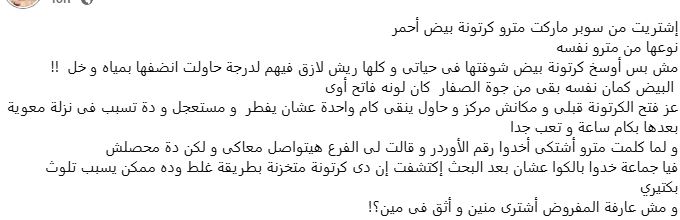 وأضافت: "لما كلمت السوبر ماركت أشتكي، خدوا رقم الأوردر وقالوا الفرع هيتواصل معايا، لكن ده محصلش، وبعد ما بحثت اكتشفت إن الكرتونة كانت متخزنة بطريقة غلط، وده ممكن يسبب تلوث بكتيري خطير".