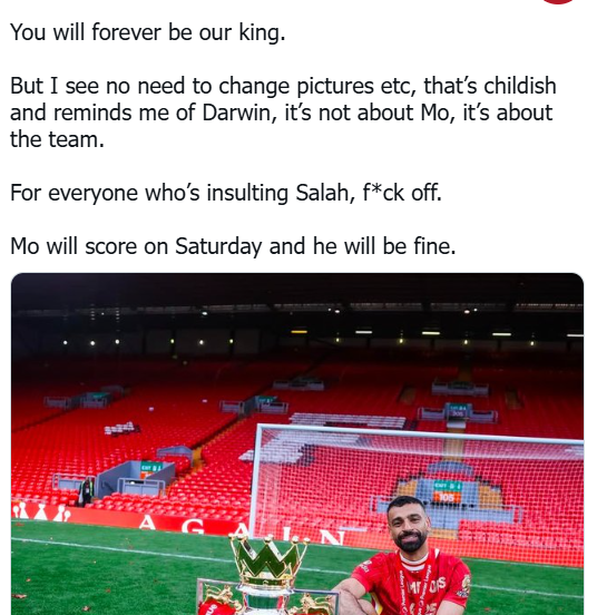 وحذف صلاح، كلمة “لاعب في ليفربول” من التعريف الشخصي في حسابه، مكتفيًا بعبارة “يقيم في ليفربول”، كما غيّر صورة حسابه الرسمي، مستبدلًا صورته بقميص النادي ووضع محلها صورة شخصية تجمعه بابنتيه.