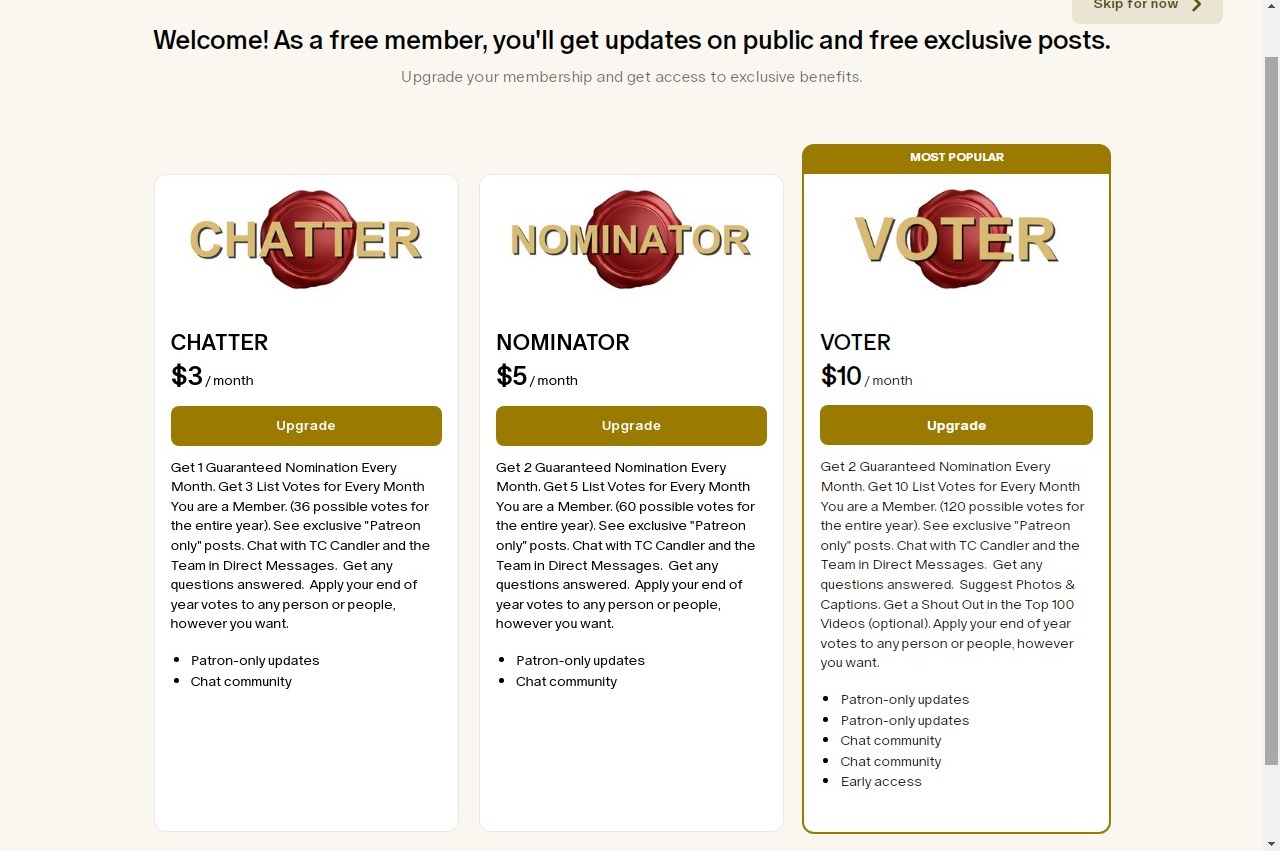على سبيل المثال يتيح موقع Patreon ثلاثة باقات شهرية للمشاركة في المسابقة، الاشتراكات تتدرج من 3 إلى 10 دولارات وتمنح المشتركين مزايا ترشيح عدد من الأسماء المشهورة شهريًا، كما تمنح عدد محدود من الأصوات التي تستخدم في تقوية فرص المرشحين خلال التصفيات.